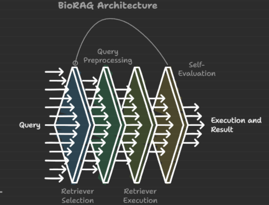 Query Input ↓ MeSH Filtering (if applicable) ↓ Vector Similarity Ranking (within the MeSH filtered results) ↓ Specialized Database Access (if needed) ↓ Self-Evaluation ↓ Additional Retrieval (if necessary)Multiple sources are not used simultaneously, but rather, sequentially. If the self evaluation mechanism deems it necessary for a different knowledge base to be used for additional information, we go back to the Retriever Selection step to choose a new knowledge base.
